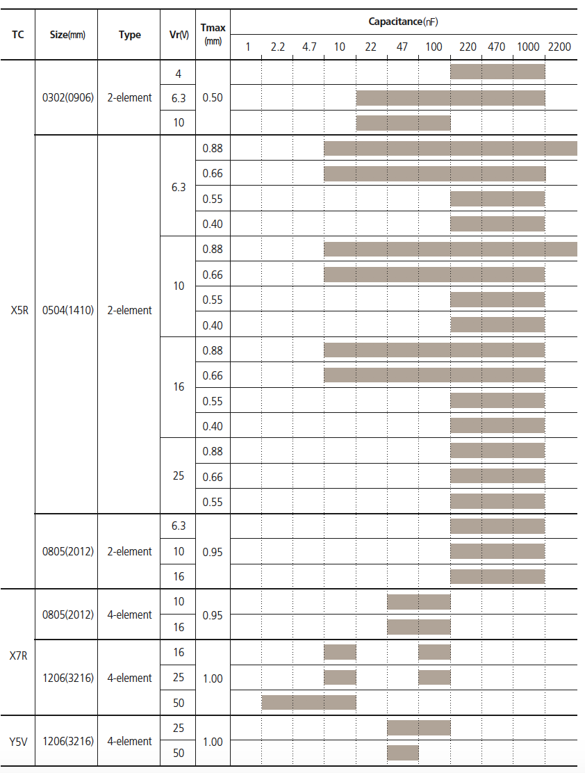 Provide more capacitance per volumetric area: Efficiently use the side margins and thickness. Promoting mounting efficiency. One chip of CA equals to four chips of 0603 type capacitor. So it can reduce times of picking and placing.